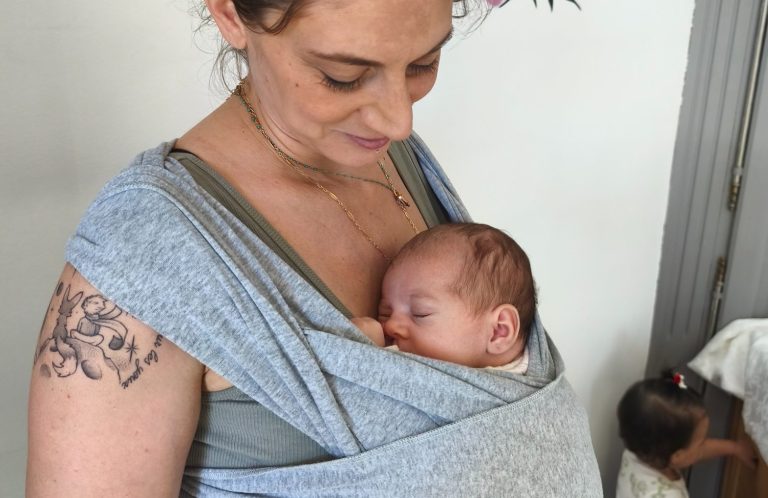 Atelier portage en écharpe — 80 € / 1 h30, avec une vidéo personnalisée pour reproduire les gestes à la maison, à Saint‑Zacharie ou à domicile.